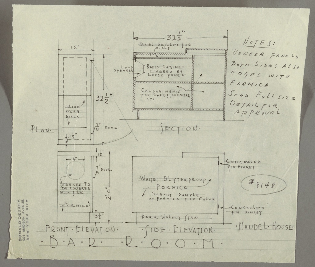 Inscribed in graphite, upper right: NOTES: / VENEER PANELS / BOTH SIDES ALSO / EDGES WITH / FORMICA / SEND FULL SIZE / DETAIL FOR APPROVAL; in graphite, lower right: #8148 [circled]; in graphite, lower left: -B-A-R- -R-O-O-M-; in graphite, lower right: -MANDEL-HOUSE-; in graphite: dimensions, views, materials, instructions