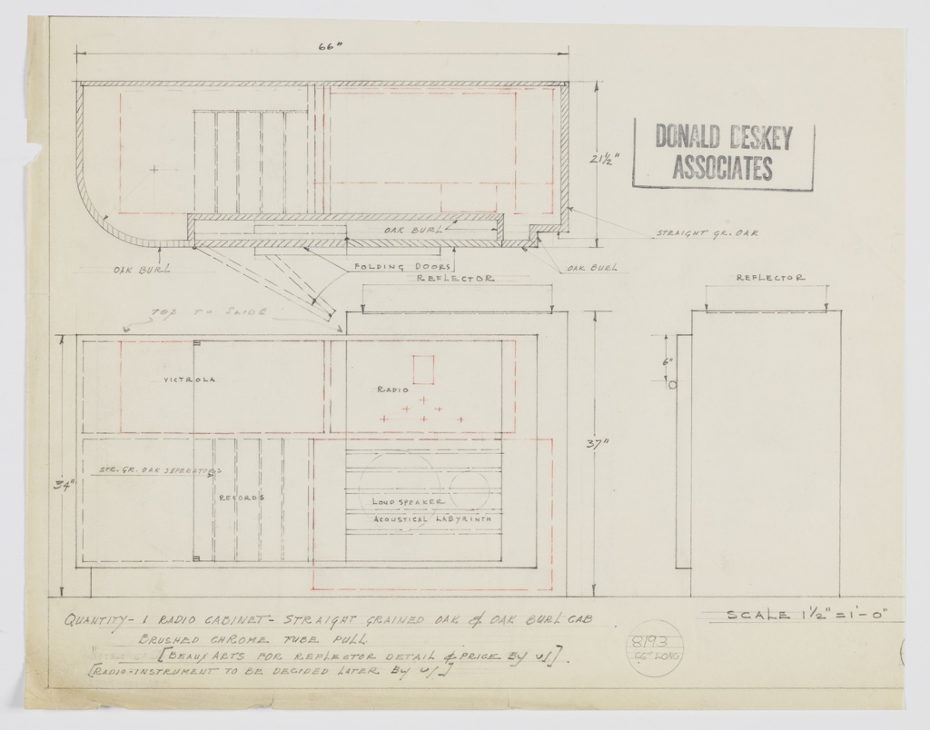 Inscribed in graphite, lower left: QUANTITY- 1 RADIO CABINET- STRAIGHT GRAINED OAK & OAK BURL CAB / BRUSHED CHROME TUBE PULL / [BEAUX ARTS FOR REFLECTOR DETAIL & PRICE BY US.] / [RADIO-INSTRUMENT TO BE DECIDED LATER BY US.]; in graphite, lower right: 8193 / 66" LONG [circled]; in graphite, lower right: SCALE 1 1/2"=1'–0"; in graphite: dimensions, views, materials