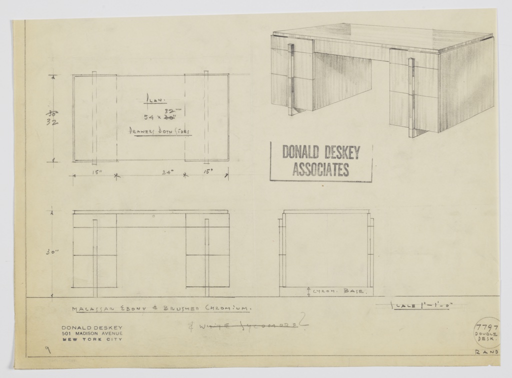 Inscribed in graphite, lower left: MACASSAR EBONY & BRUSHED CHROMIUM / & WHITE SYCAMORE? [crossed out]; in graphite, lower right: SCALE 1"—1'–0"; in graphite, lower right: 7797 / DOUBLE / DESK. [circled]; in graphite, lower right: RAND; in graphite: dimensions, specs