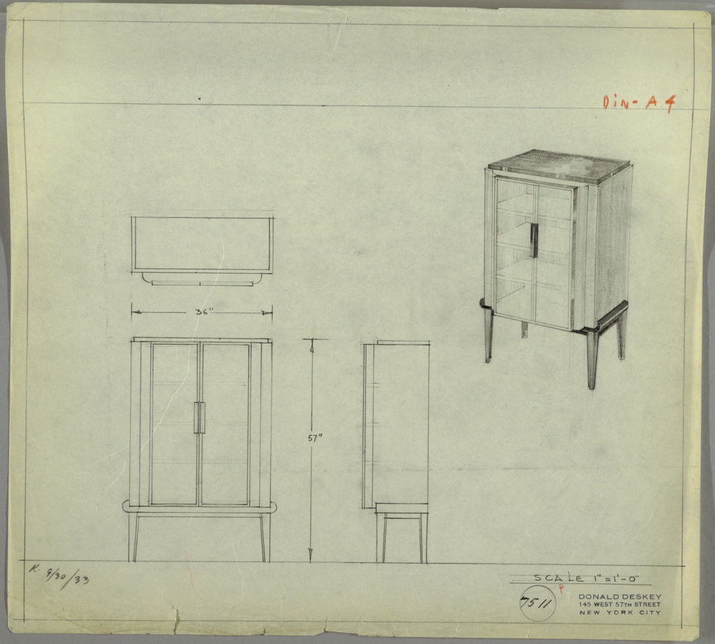 Drawing, Design for Cabinet; Office of Donald Deskey (American, 1894–1989); Drafted by K.; Manufactured by Kroehler Manufacturing Co.; USA; graphite on tracing paper; 34 x 37.4 cm (13 3/8 x 14 3/4 in.); Gift of Donald Deskey; 1988-101-177