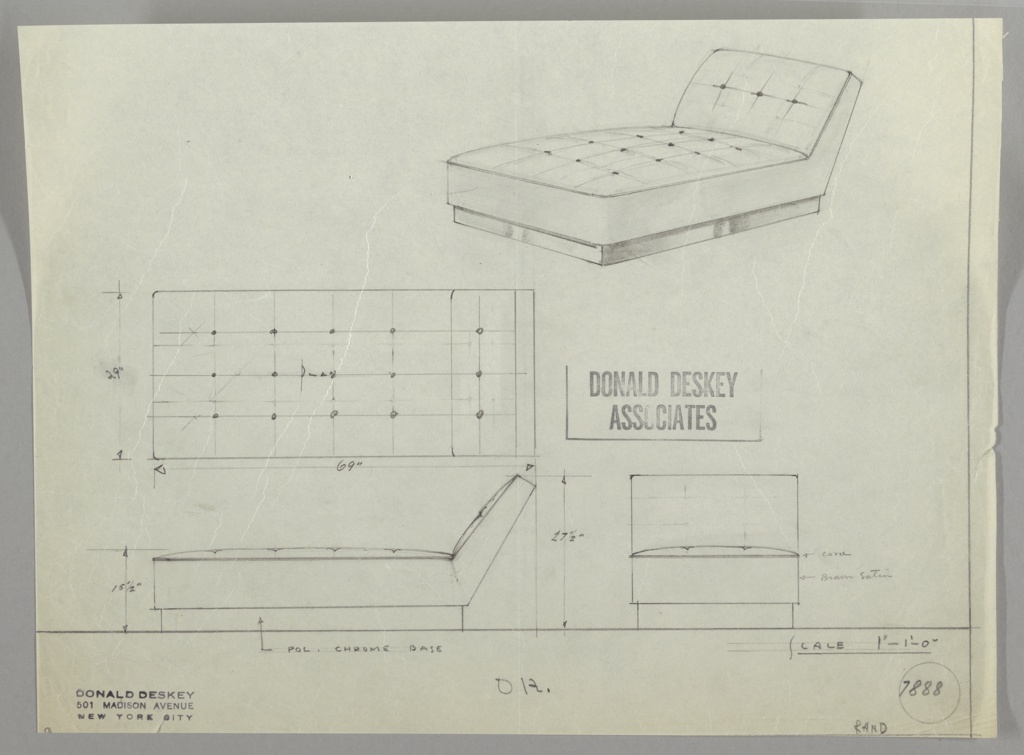 Inscribed in graphite, lower left: POL. CHROME BASE; in grahpite, lower center: OK.; in graphite, lower right: cord / Brown Satin; in graphite, lower right: SCALE 1"—1'–0"; in graphite, lower right: 7888 [circled]; in graphite, lower right: RAND; in graphite: dimensions, views, materials