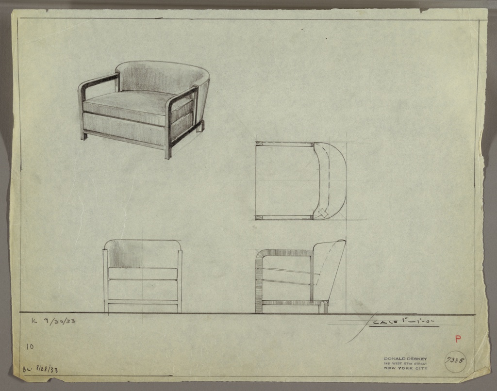 This is a Drawing. It was from the office of Donald Deskey and drafted by K. and manufactured by K. and Kroehler Manufacturing Co.. It is dated 1933 and we acquired it in 1988. Its medium is graphite on tracing paper. It is a part of the Drawings, Prints, and Graphic Design department.