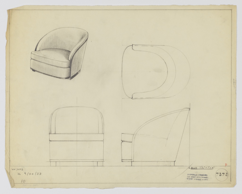 This is a Drawing. It was from the office of Donald Deskey and drafted by K. and manufactured by K. and Kroehler Manufacturing Co.. It is dated September 30, 1933 and we acquired it in 1988. Its medium is graphite on tracing paper. It is a part of the Drawings, Prints, and Graphic Design department.