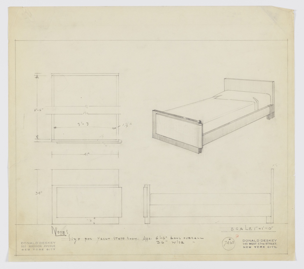 Inscribed in graphite, lower left: NOTE! [underlined] / SIZE FOR YACHT STATE ROOM. APPR. 6'–6" LONG OVERALL / 36" WIDE "; in graphite, lower right: SCALE 1"=1'-0"; in red color pencil, lower right: P; in graphite, lower right: # / 7468 [encircled]; in graphite: dimensions