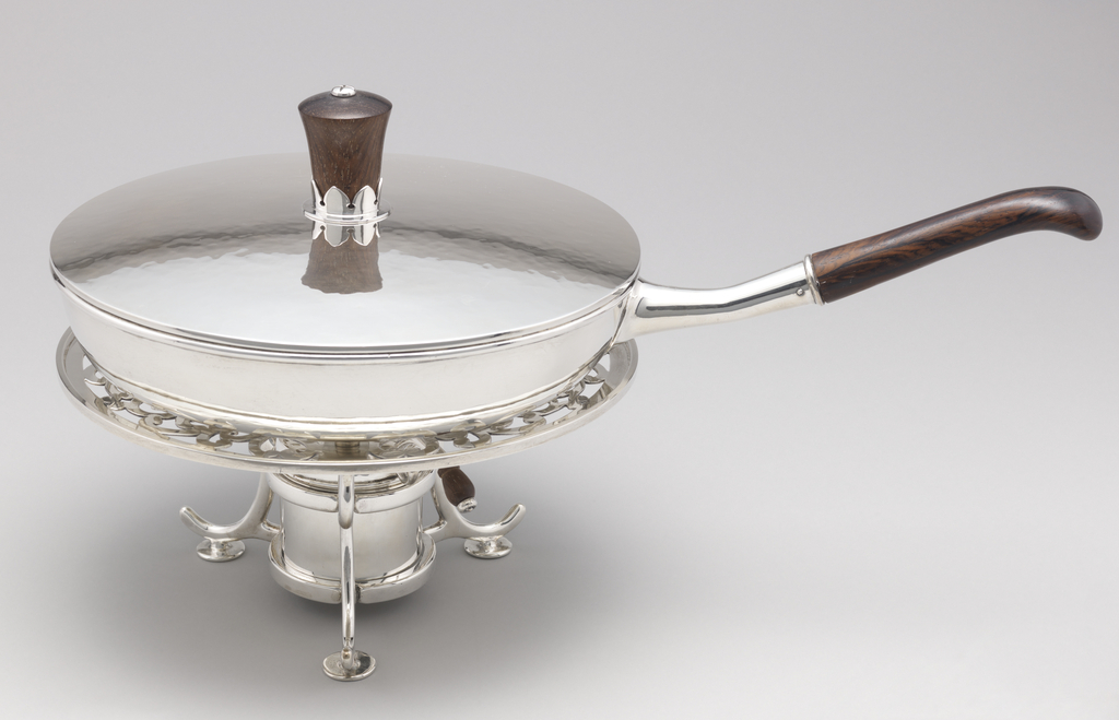Chafing Dish Chafing Dish; Helen K. Simon Flowers (American, 1911–1950); USA; silver, rosewood; H x W x D (overall pan and cover - (a) and (b)): 13.6 × 44.8 × 22.5 cm (5 3/8 × 17 5/8 × 8 7/8 in.) H x diam. (stand (c)): 12.2 × 25.4 cm (4 13/16 in. × 10 in.); Gift of Helen K. Flowers; 1989-105-1-a/e