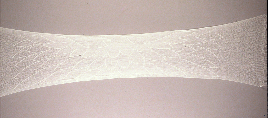This is a Scarf. It was designed by Junichi Arai. It is dated mid-1980s and we acquired it in 1989. Its medium is silk and its technique is made on a raschel machine. It is a part of the Textiles department.