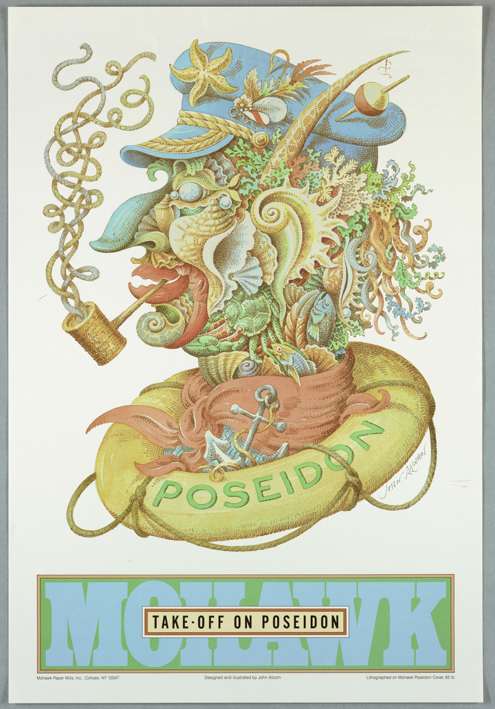 Imprinted in black ink, lower margin: Mohawk Paper Mills, Inc., Cohoes, NY 12047; Designed and Illustrated by John Alcorn; Lithographed on Mohawk Poseidon Cover, 65 lb.