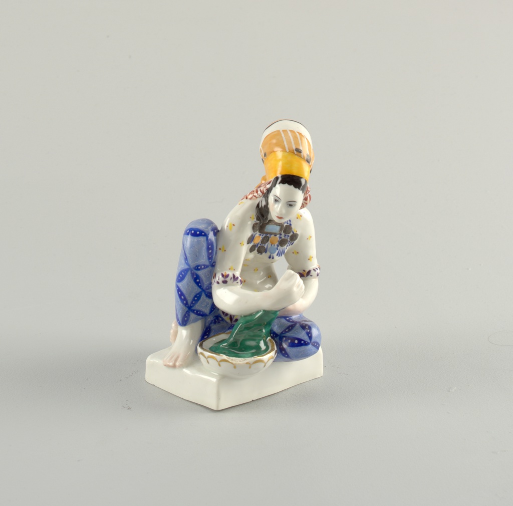 Uzbek Woman Washing Clothes Figure; Manufactured by Lomonosov Porcelain Factory (Russia); porcelain, enamel, gilding; H: 14.7 cm (5 13/16 in.); The Henry and Ludmilla Shapiro Collection; Partial gift and partial purchase through the Decorative Arts Association Acquisition and Smithsonian Collections Acquisition Program Funds; 1989-41-135