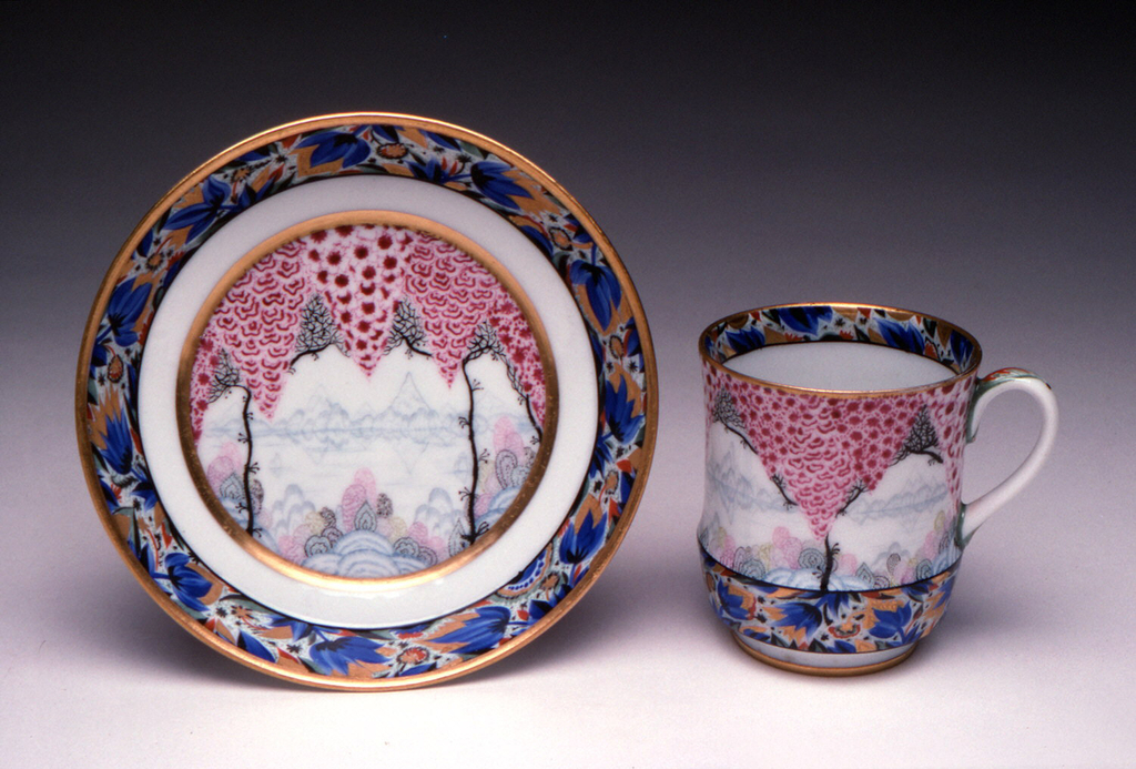 Ornamental Landscape Cup And Saucer; Designed by Alexei Viktorovich Vorobyevsky (1906); Manufactured by Lomonosov Porcelain Factory (Russia); porcelain, enamel, gilding; H x diam.: 7.5 x 13.5 cm (2 15/16 x 5 5/16 in.); The Henry and Ludmilla Shapiro Collection; Partial gift and partial purchase through the Decorative Arts Association Acquisition and Smithsonian Collections Acquisition Program Funds; 1989-41-74-a,b