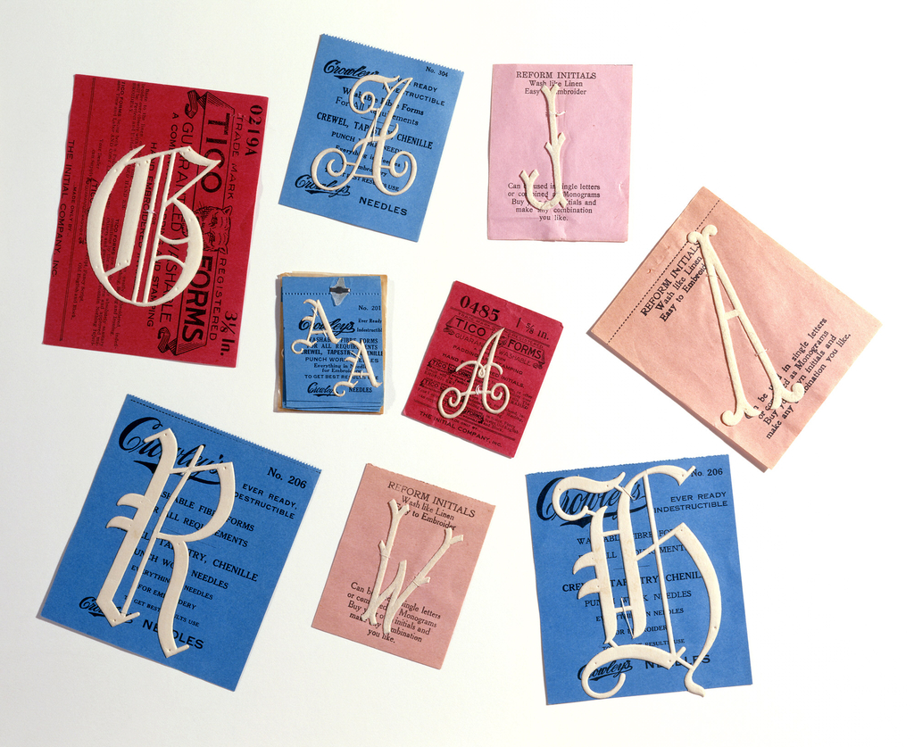 Embroidery Form, Crowley's Fiber Letter Foundations for Embroidery; Distributed by Crowley's Department Store (United States); USA; pressed cotton and synthetic felt, cotton thread, letterpress on colored wove paper; 9 x 7.4 cm (3 9/16 x 2 15/16 in.); Gift of Mickey Mariash; 1990-35-27-1,2