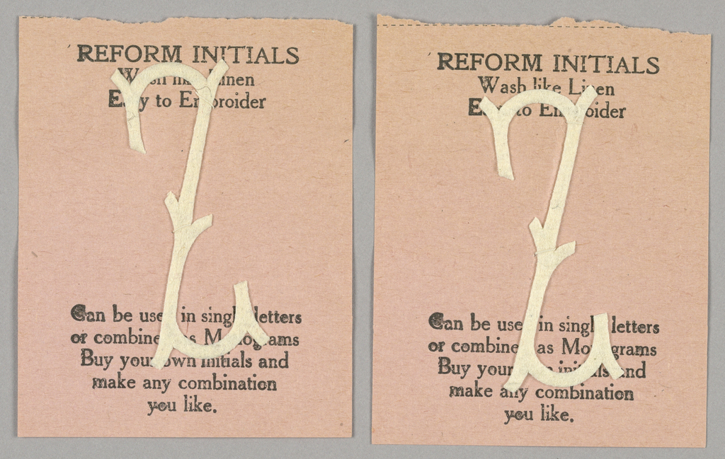 Embroidery Form, Crowley's Fiber Letter Foundations for Embroidery; Distributed by Crowley's Department Store (United States); USA; pressed cotton and synthetic felt, cotton thread, letterpress on colored wove paper; 9 x 7.4 cm (3 9/16 x 2 15/16 in.); Gift of Mickey Mariash; 1990-35-38-1,2