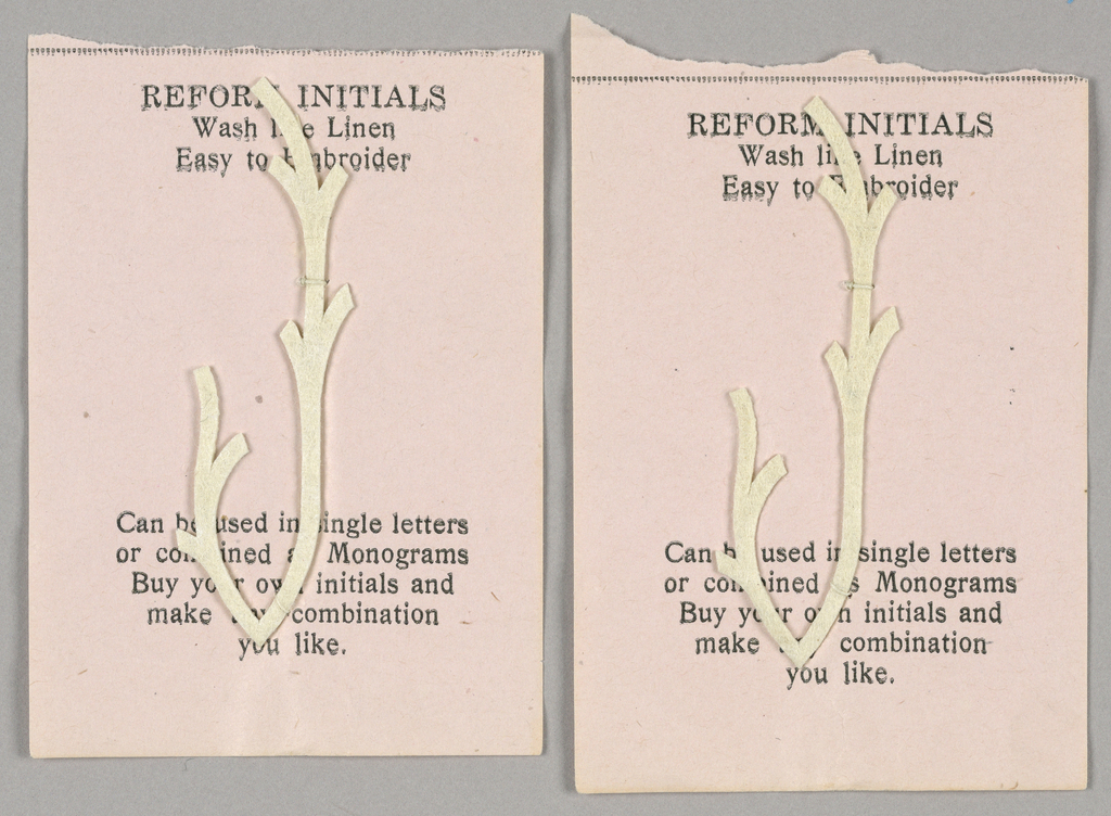 Embroidery Form, Crowley's Fiber Letter Foundations for Embroidery; Distributed by Crowley's Department Store (United States); USA; pressed cotton and synthetic felt, cotton thread, letterpress on colored wove paper; 10 x 7.4 cm (3 15/16 x 2 15/16 in.); Gift of Mickey Mariash; 1990-35-41-1,2