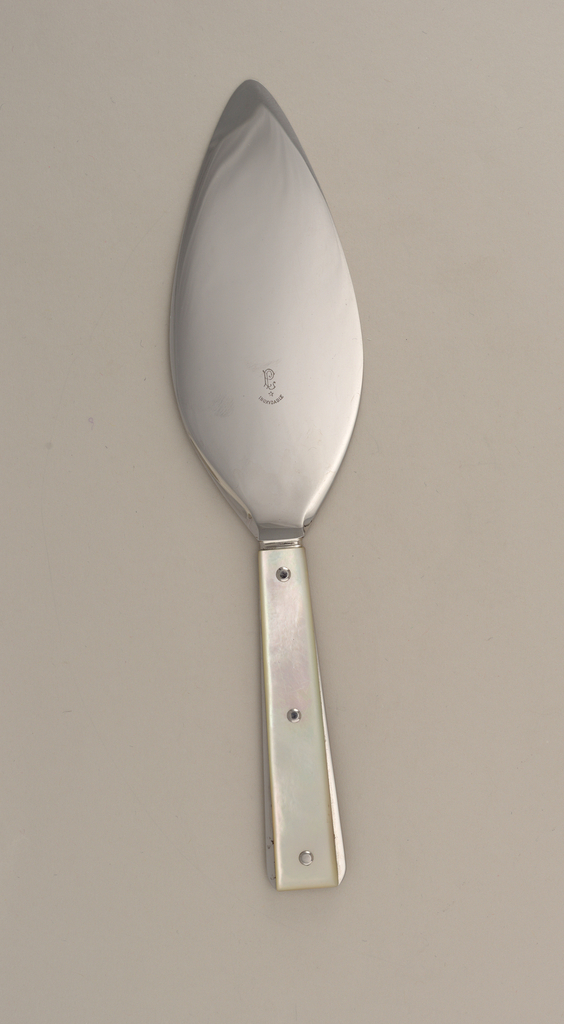 Knife (France); Made by Loius Pernet Eloi; Retailed by Maison Pernet; steel, mother-of-pearl; L x W: 23 x 7.5 cm (9 1/16 x 2 15/16 in.); Gift of Mr. and Mrs. John M. Thompson in memory of Mr. and Mrs. G. Auclair; 1990-67-7