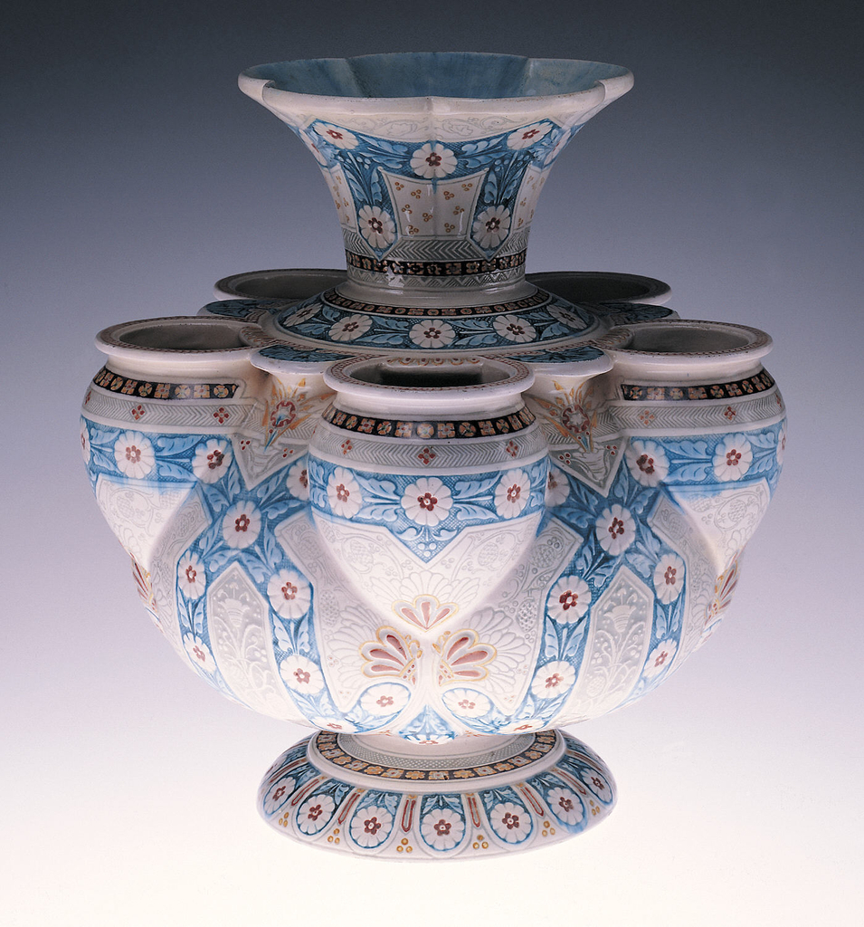 This vase was exhibited at the London International Exposition of 1871, where it recieved highly favorable attention. Theodore Deck's ceramics were recognized for their adaptations of Islamic forms, ornament, and range of colors. This vase reflects his fascination with Eastern designs, its shape echoing that of a mosque lamp. (Recent Acquisitions, 4/91)/