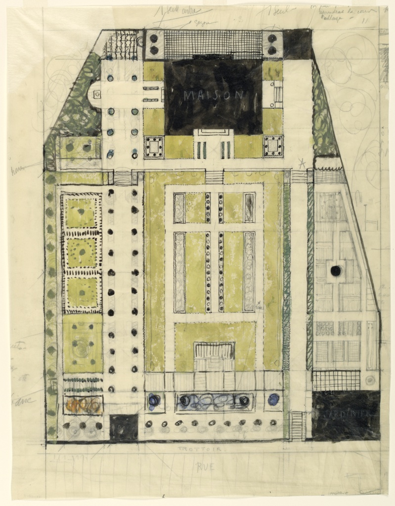 Drawing, Ground Plan of a Formal Garden; Designed by André Vera (French, active Paris, 1881–1971), Paul Vera (French, active Paris, 1882–1957); Drafted by Eugène Verdeau (French); France; pen and black ink, brush and green, blue, orange watercolor, graphite on tracing paper; 41.8 × 32.3 cm (16 7/16 × 12 11/16 in.) Mat: 55.9 × 40.6 cm (22 × 16 in.); Museum purchase from Smithsonian Institution Collections Acquisition Program Fund; 1991-58-15