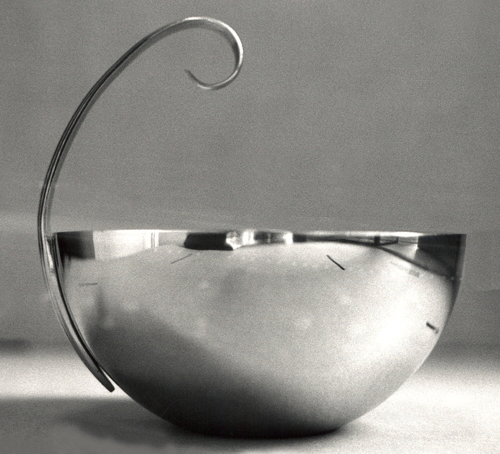 This is a Ice bowl and tongs. It was designed by Russel Wright. It is dated ca. 1934 and we acquired it in 1991. Its medium is chrome-plated metal. It is a part of the Product Design and Decorative Arts department.