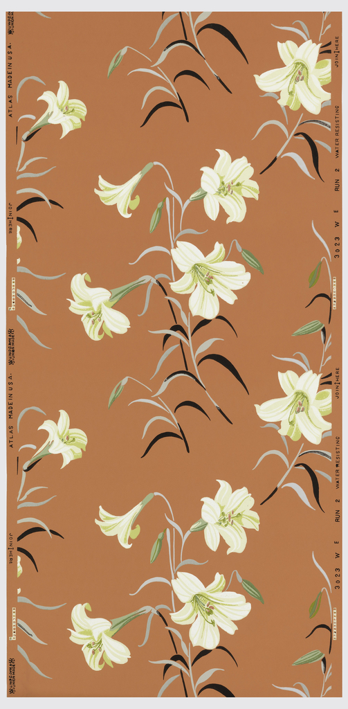 This is a Sidewall. It was manufactured by Atlas Wall Paper Mills, Inc.. It is dated 1936–50 and we acquired it in 1991. Its medium is machine-printed. It is a part of the Wallcoverings department.