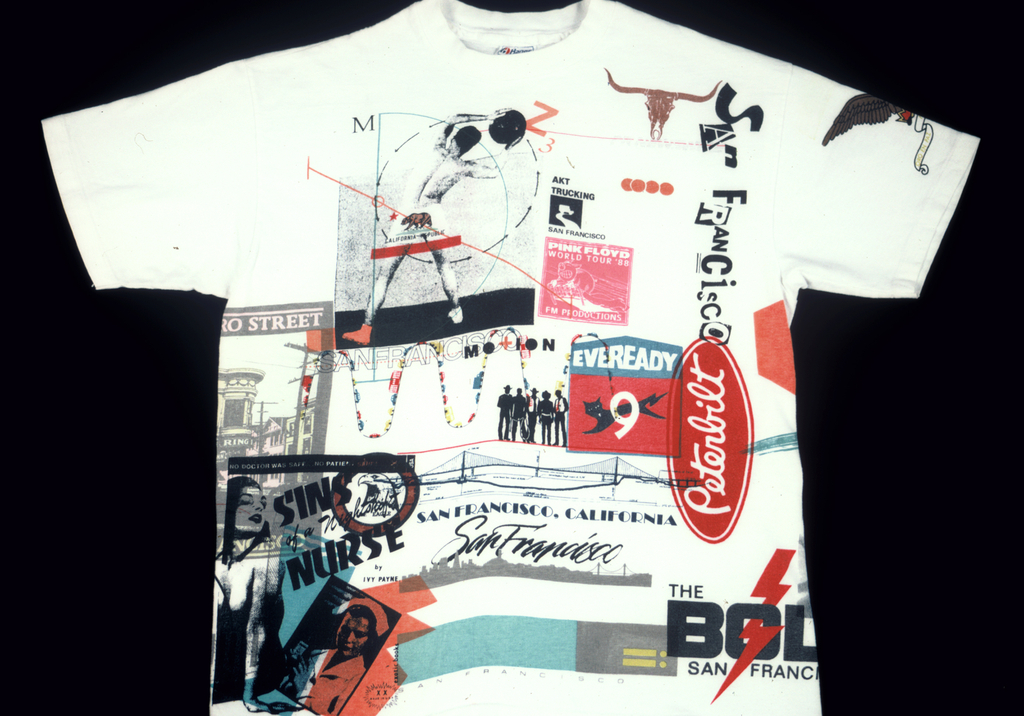 T-shirt (USA); Designed by David Exley (1948 – 1990); Height: 73cm (28 3/4in.) Width (sleeve edge to selleve edge): 91.5cm (36in.).; Gift of Eddie Squires; 1992-3-7