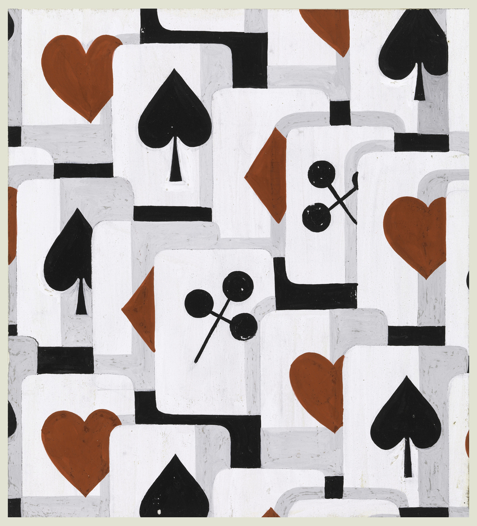 Drawing, Playing Card Motif, Textile Design; Designed by Tommi Parzinger (American, b. Germany, 1903–1981); USA; brush and gouache on paper, lined; Sheet: 13.7 x 12.5 cm (5 3/8 x 4 15/16 in.); Gift of Donald Cameron; 1992-51-65