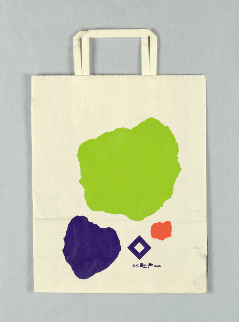 Shopping Bag, Unknown: Green, Purple and Orange; Japan; paper; white paper handles; 39.7 x 25.4 cm (15 5/8 x 10 in. ); Gift of Suzanne Sekey; 1992-77-17