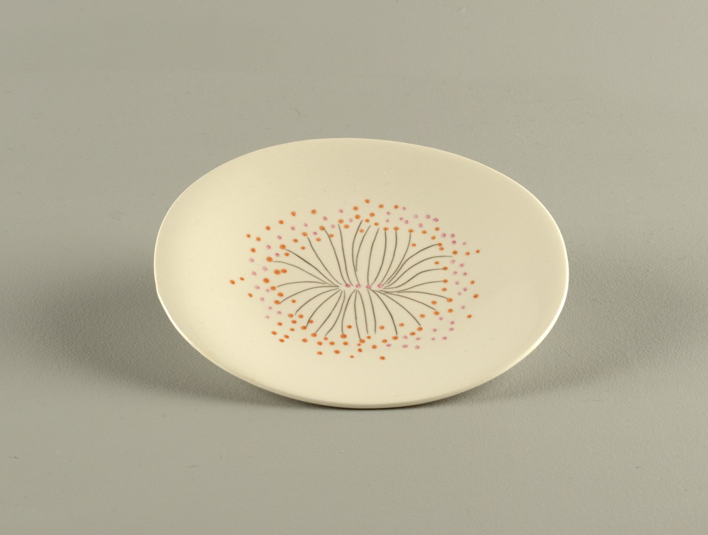 This is a plate. It was designed by Eva Zeisel and Charles Seliger and manufactured by Hall China Company. It is dated 1952 and we acquired it in 1992. Its medium is earthenware. It is a part of the Product Design and Decorative Arts department.