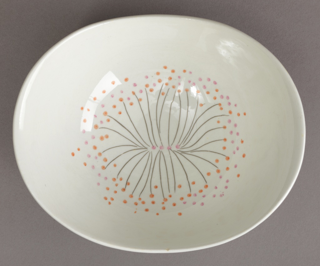 This is a Bowl. It was designed by Eva Zeisel and Charles Seliger and manufactured by Hall China Company. It is dated 1952 and we acquired it in 1992. Its medium is earthenware. It is a part of the Product Design and Decorative Arts department.