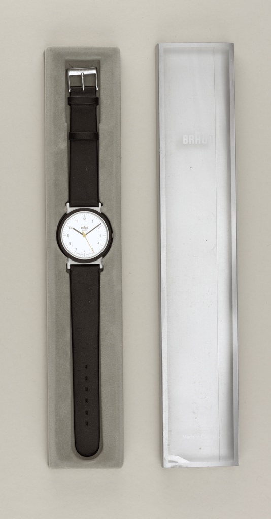 This is a watch. It was designed by Dieter Rams and Dietrich Lubs and manufactured by Braun AG. It is dated 1992–93 and we acquired it in 1993. Its medium is stainless steel, quartz movement, glass, leather band. It is a part of the Product Design and Decorative Arts department.