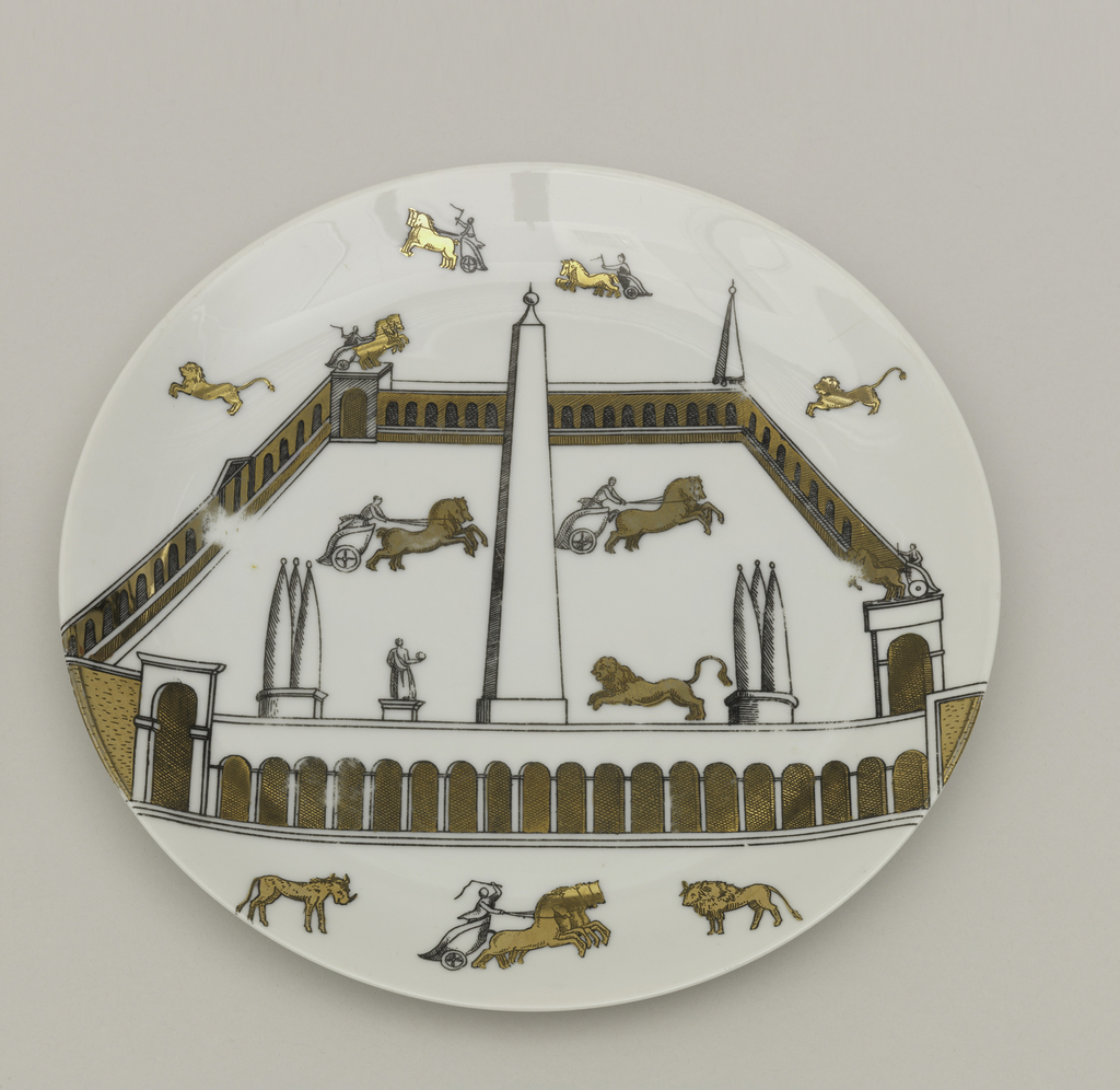 This is a plate. It was designed by Piero Fornasetti. It is dated 20th century and we acquired it in 1993. Its medium is enameled and gilt porcelain. It is a part of the Product Design and Decorative Arts department.