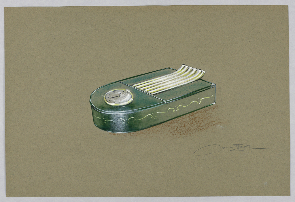 Drawing, Green clock with floral design; Designed by Alfons Bach (American, b. Germany, 1904–1999); USA; brush and gouache, chalk on beige paper; 31 x 46.3 cm (12 3/16 x 18 1/4 in.); Gift of Alfons Bach; 1993-108-345