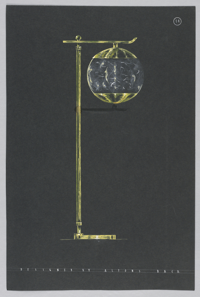 Drawing, 14. Floor lamp with hangi; Designed by Alfons Bach (American, b. Germany, 1904–1999); USA; chalk, watercolor, wash, black paper; Gift of Alfons Bach; 1993-108-57