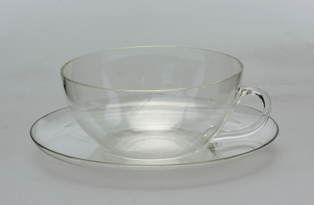 This is a cup and saucer. It is dated 1932 and we acquired it in 1993. Its medium is mold-blown and tooled glass. It is a part of the Product Design and Decorative Arts department.