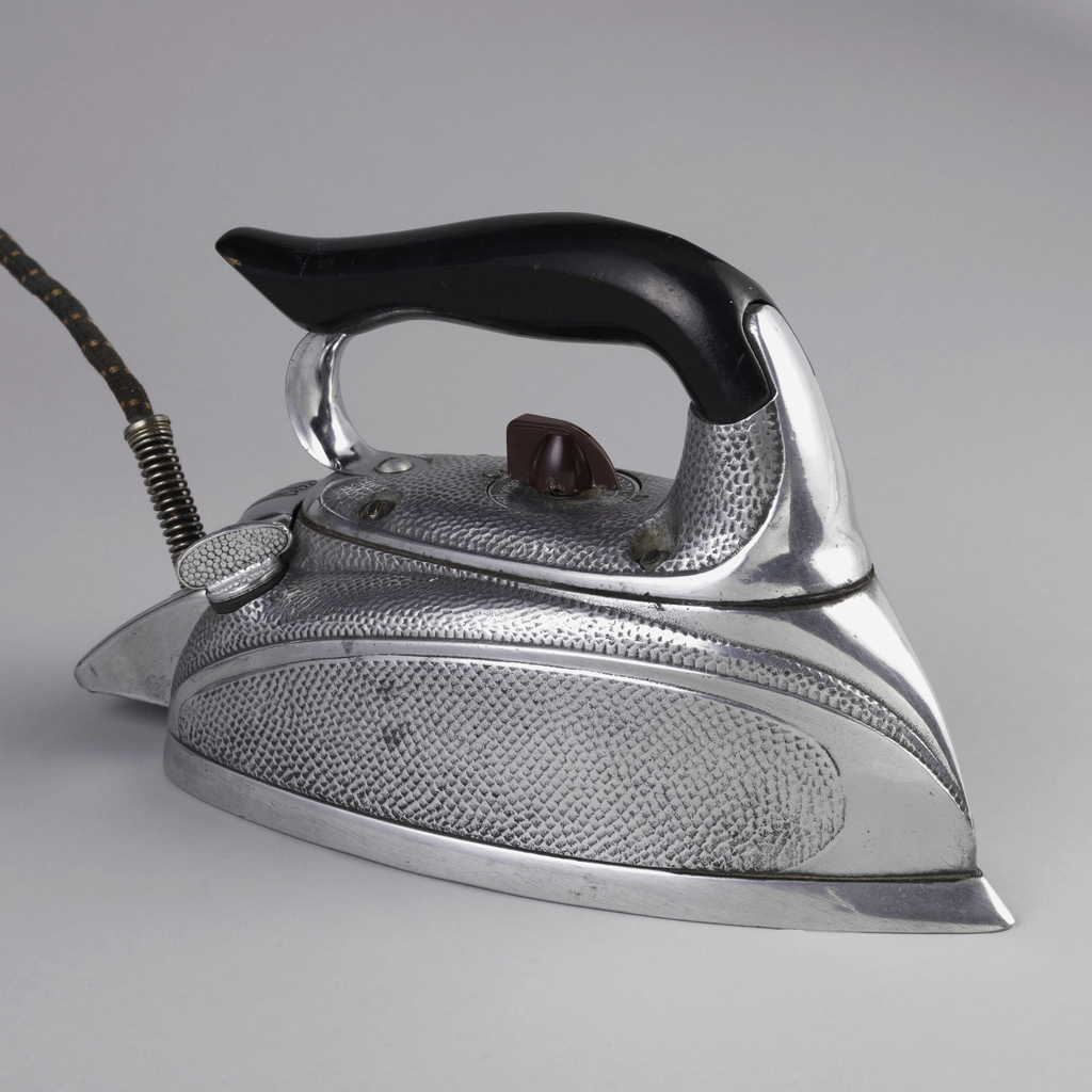 This is a Iron. It was manufactured by Steam-O-Matic Corporation. It is dated ca. 1939 and we acquired it in 1993. Its medium is cast aluminum, painted wood. It is a part of the Product Design and Decorative Arts department.