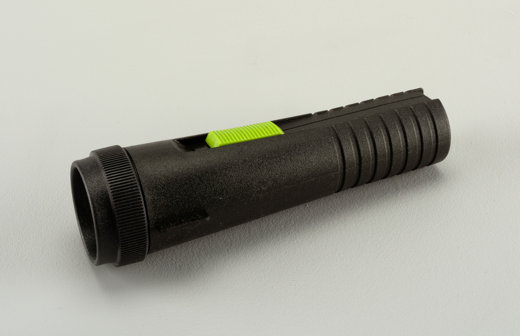 This is a flashlight. It is dated ca. 1980 and we acquired it in 1993. Its medium is plastic, metal, glass. It is a part of the Product Design and Decorative Arts department.