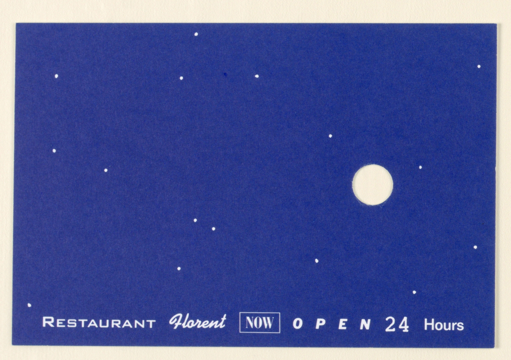 Postcard, Restaurant Florent: Now Open 24 Hours; Design Director: Tibor Kalman (American, b. Hungary, 1949–1999); Firm: M&Co (United States); USA; offset lithography; 10 x 15.2 cm (4 x 6); Gift of Tibor Kalman/ M & Co.; 1993-151-283