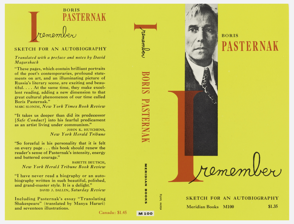 Printed in black, vertically, front cover lower left: elaine lustig; in black and red, at top: BORIS / PASTERNAK; in black and red, lower center: I remember; in black, below: SKETCH FOR AN AUTOBIOGRAPHY / Meridian Books M100 $1.35