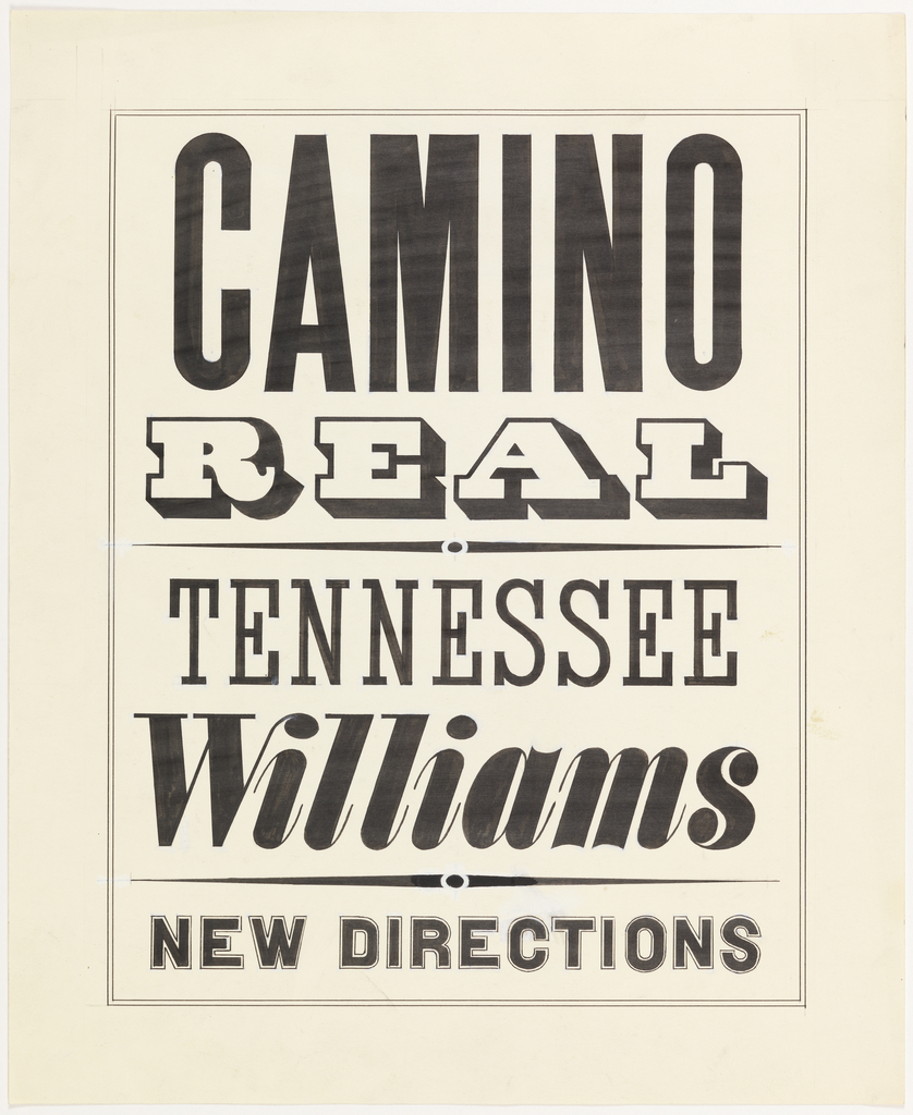 Book Cover, Bookjacket Design for "Camino Real" by Tennessee Williams; Designed by Alvin Lustig (American, 1915–1955); Written by Tennessee Williams (American, 1911–1983); felt tip pen and black ink on off-white wove paper; H x W: 34.5 x 28.4 cm (13 9/16 x 11 3/16 in.); Gift of Tamar Cohen and Dave Slatoff; 1993-31-153