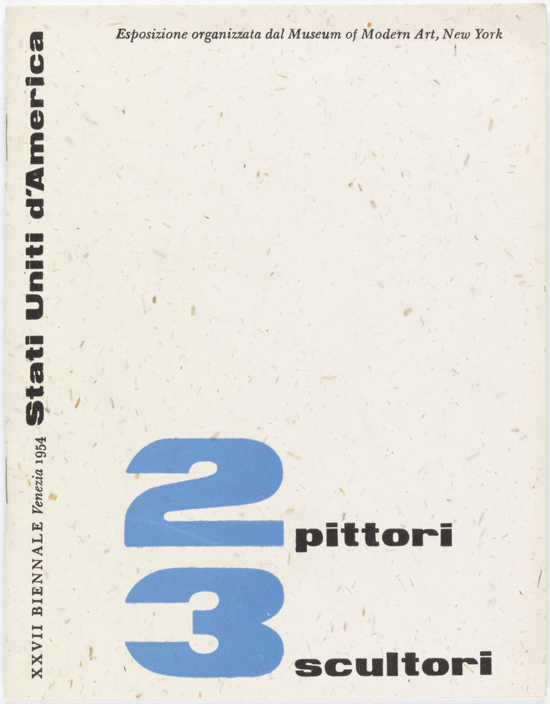 Printed vertically in black ink, left margin: XXVII VIENNALE Venezia 1954 Stati Uniti d'America. Printed horizontally in black ink, upper margin: Exposizione organizzata dal Museum of Modern Art, New York; lower right: pittori/scultori. Printed in blue ink, left center: 2/3.