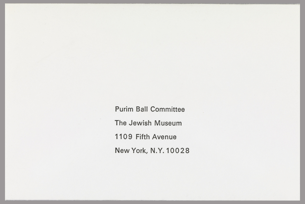 Printed in black, lower center: Purim Ball Committee / The Jewish Museum / 1109 Fifth Avenue / New York, N.Y. 10028.