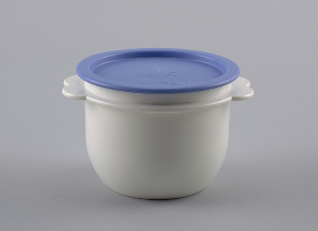 This is a Bowl and lid. It was designed by Morison S. Cousins, Brian L. Aiken and Douglas M. Laib and manufactured by Tupperware Corporation. It is dated 1992 and we acquired it in 1993. Its medium is plastic (polypropylene, polyethylene). It is a part of the Product Design and Decorative Arts department.