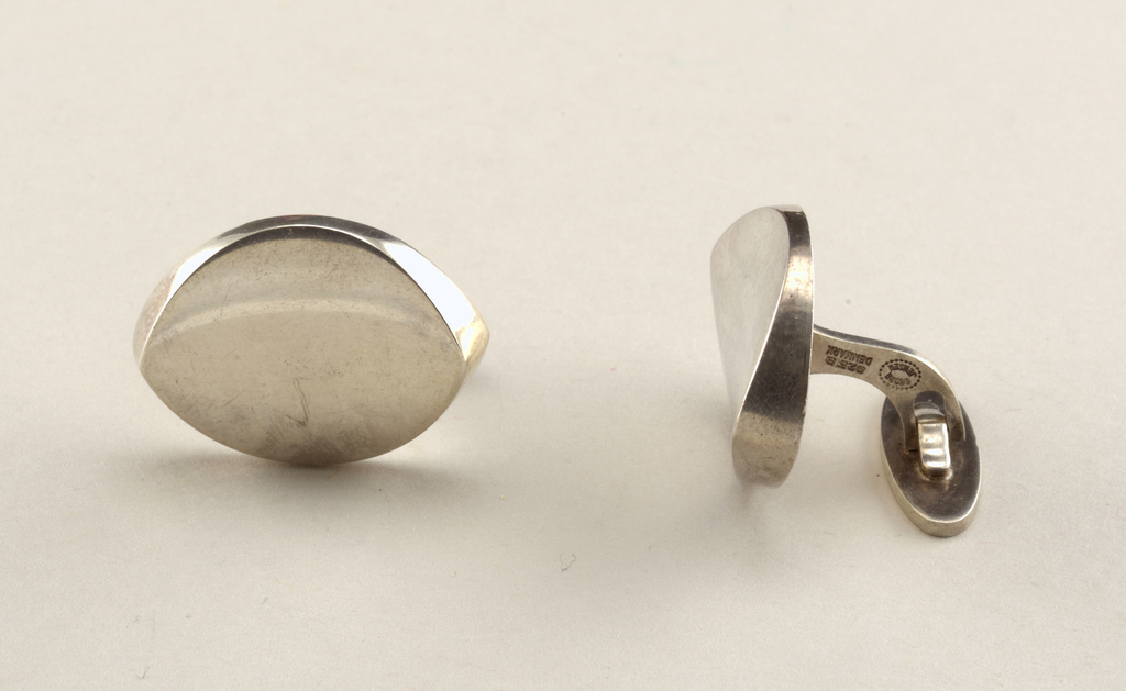 This is a cufflink. It was manufactured by Georg Jensen Sølvsmedie. It is dated ca. 1945 and we acquired it in 1994. Its medium is silver. It is a part of the Product Design and Decorative Arts department.