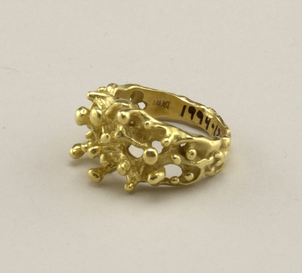This is a ring. It was made by Ed Wiener. It is dated 1961–63 and we acquired it in 1994. Its medium is gold. It is a part of the Product Design and Decorative Arts department.