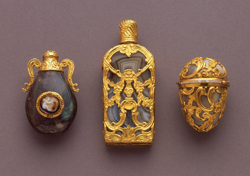Small decorative containers for holding perfume were carried by both men and women during the 18th century. These dainty vessels were fashioned from hard stones and displayed fine gold-work with flowing rococo ornamentation. (Design for Life, 1997-98).
