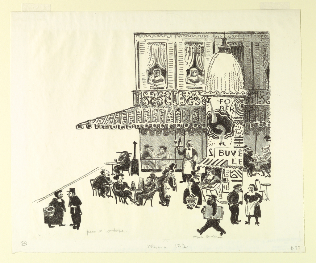 Print, Peace: It's Wonderful; Alfred Bendiner (American, 1899–1964); USA; lithograph in black ink on white wove paper with deckle edge; Image: 31.4 × 36.2 cm (12 3/8 × 14 1/4 in.); Gift of the Alfred and Elizabeth Bendiner Foundation; 1994-21-14