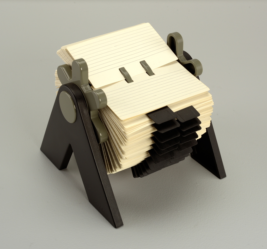Flip-File Card File; Designed by Peter Haythornthwaite (b. 1944); New Zealand; plastic, nylon, styrene; 17 x 16 x 14.7 cm (6 11/16 x 6 5/16 x 5 13/16 in.); Gift of Arango Design Foundation; 1994-31-82