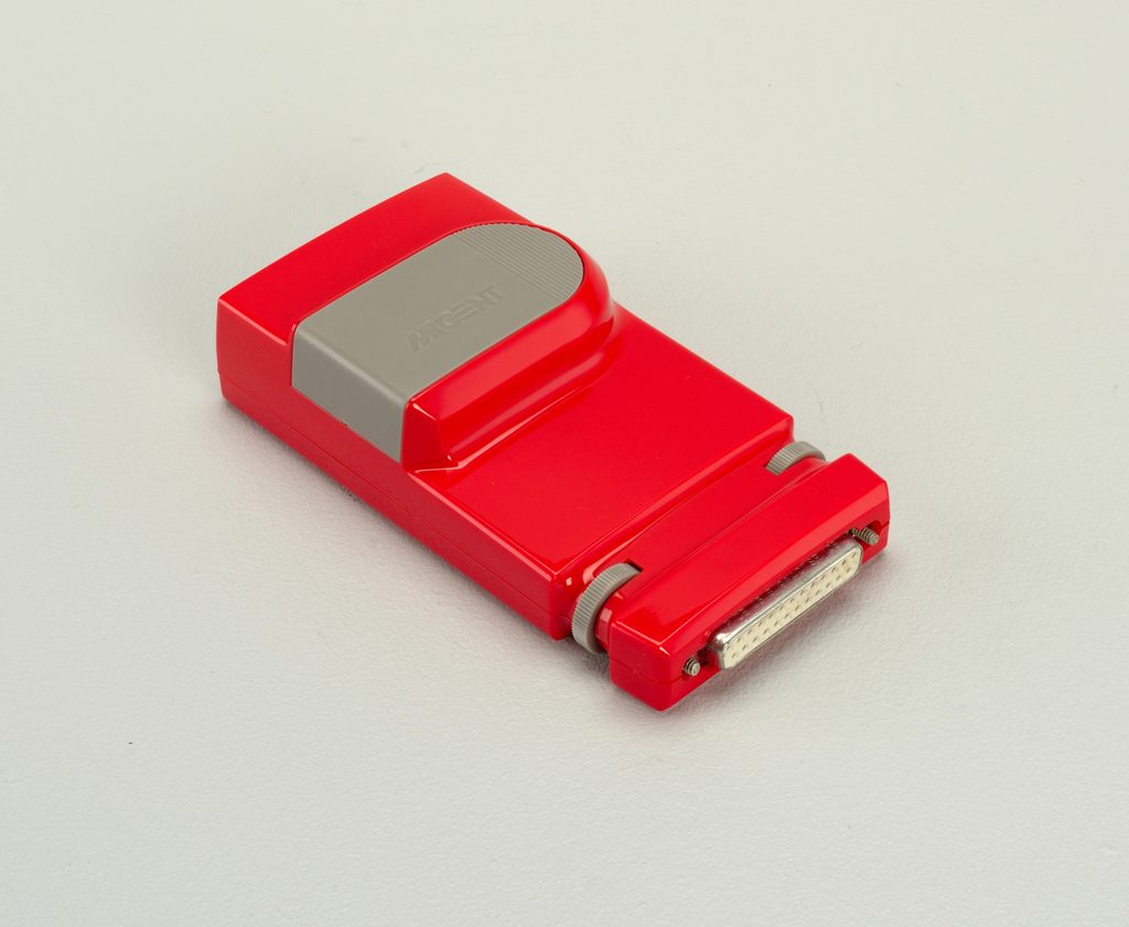 This is a Modem and cord. It was designed by Ron Clements and manufactured by Migent Inc. and firm: Designfour. It is dated 1986 and we acquired it in 1996. Its medium is polycarbonate case. It is a part of the Product Design and Decorative Arts department.