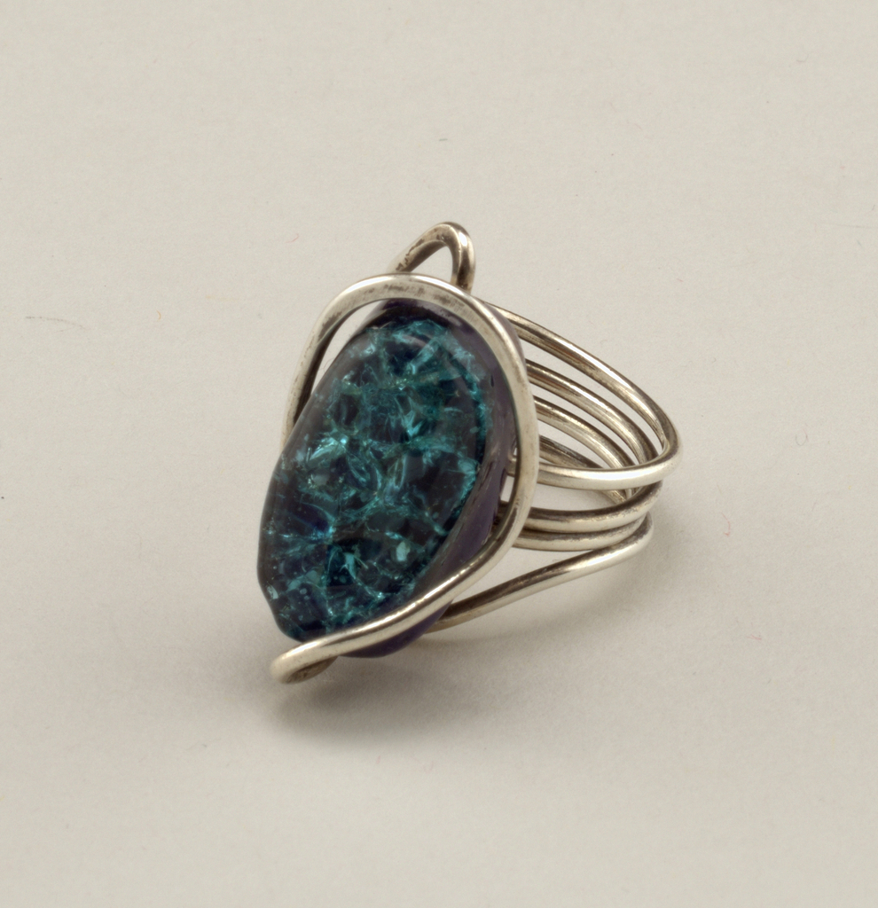 This is a ring. It was designed by Elsie Marie Bates-Freund. It is dated 1950–60 and we acquired it in 1994. Its medium is bent silver wire, enameled earthenware fused to crackled glass. It is a part of the Product Design and Decorative Arts department.