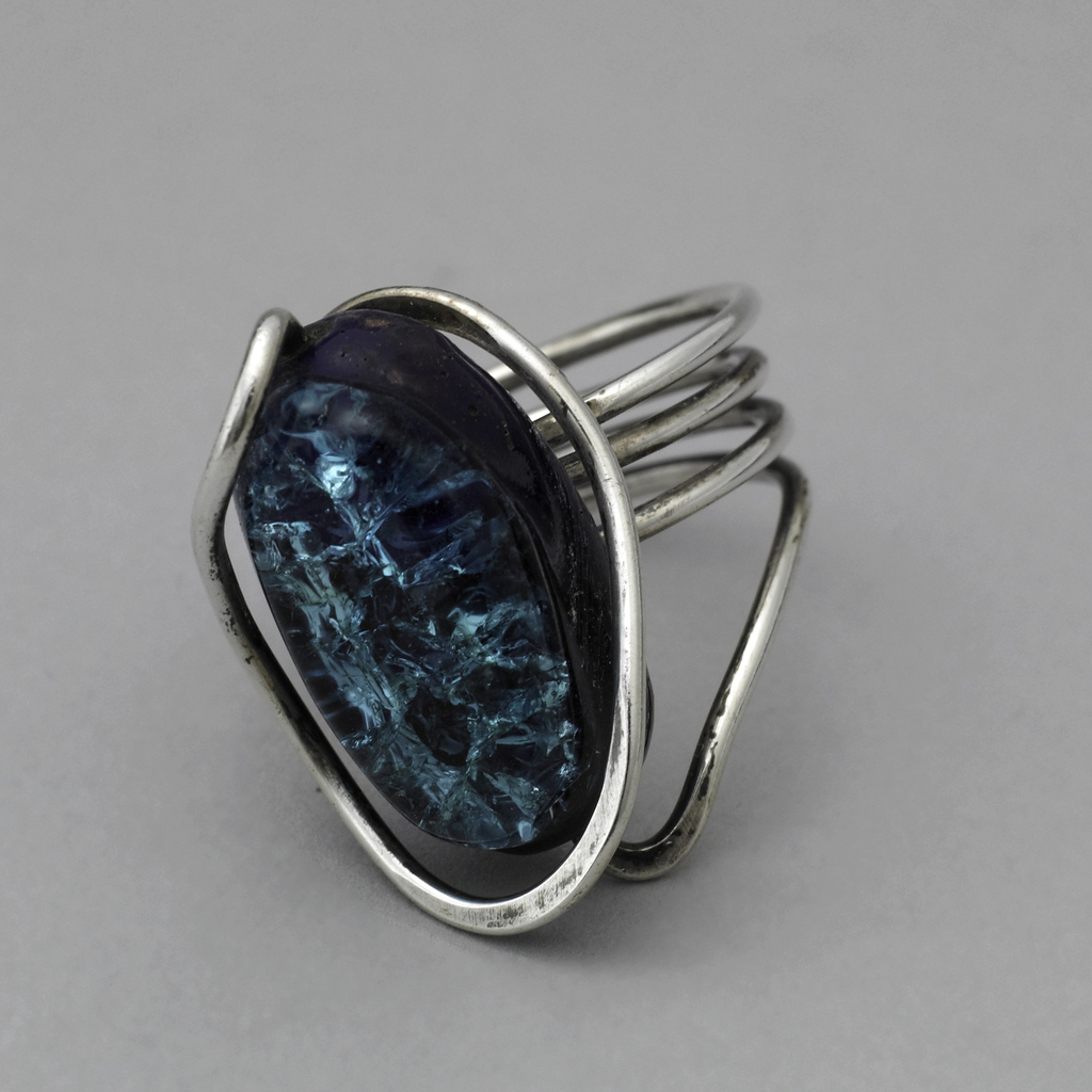 This is a ring. It was designed by Elsie Marie Bates-Freund. It is dated 1950–60 and we acquired it in 1994. Its medium is bent silver wire, enameled earthenware fused to crackled glass. It is a part of the Product Design and Decorative Arts department.