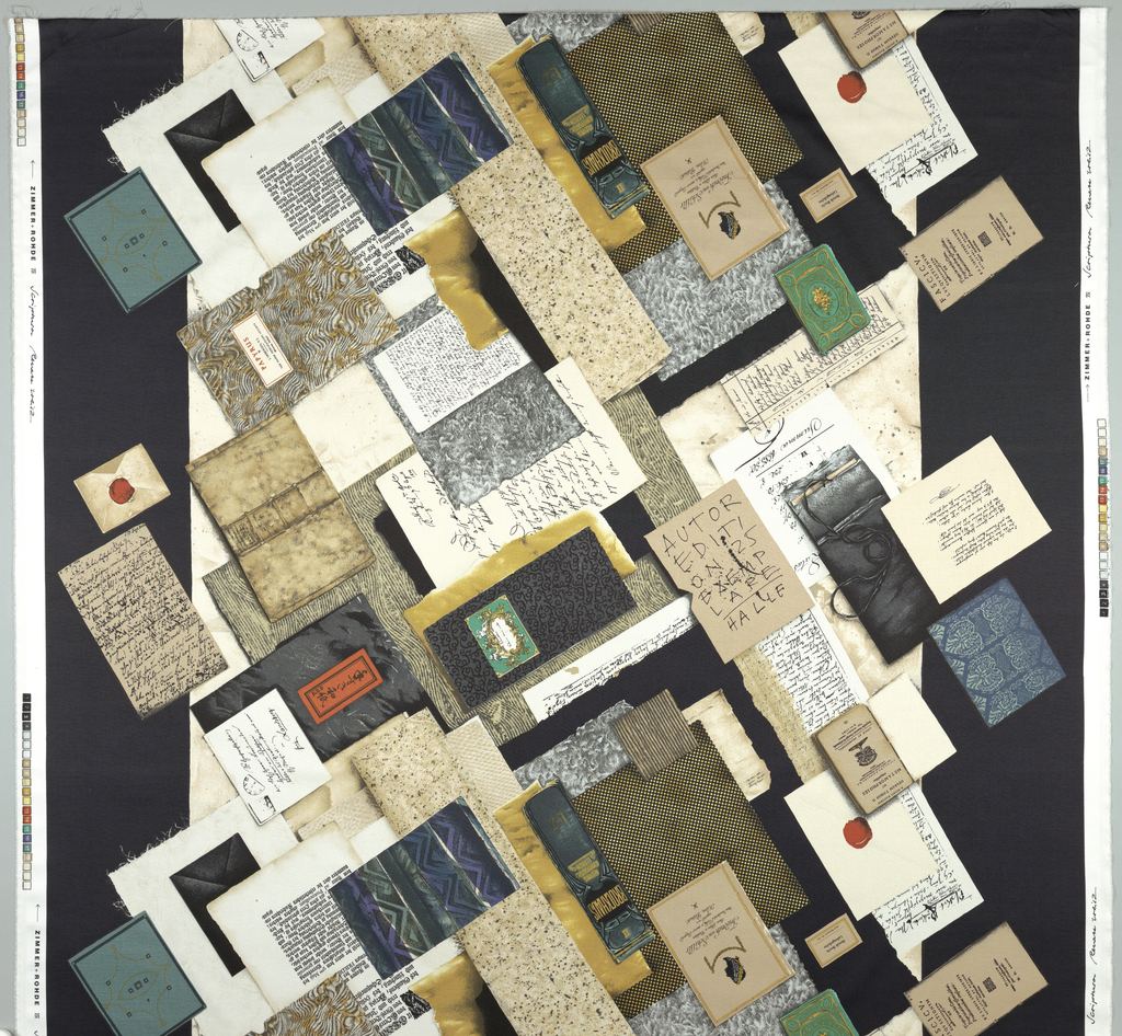 This is a Textile. It was company: Zimmer + Rohde and produced by Zimmer + Rohde. It is dated 1993 and we acquired it in 1994. Its medium is cotton and its technique is screen printed on 4&1 satin weave. It is a part of the Textiles department.