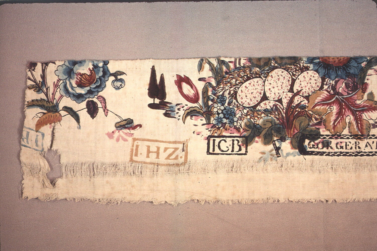 Printed stamps at one end: GORGERAT FRERES. N(?). P. A NANTES. BON TEINT within a decorative border;'15404','I.C.B.' enclosed in box. All the above in black. In blue: 'I.B.?' enclosed in box. In olive: ''I.HZ' or 'ZH.I enclosed in box.