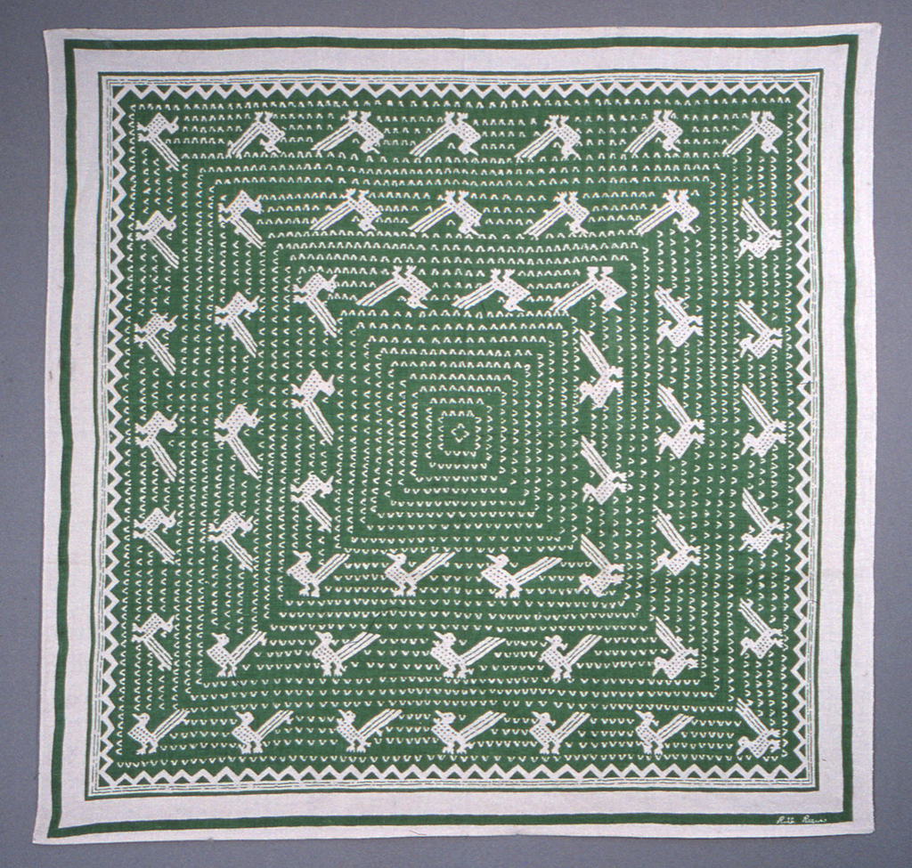 Tablecloth (USA); Designed by Ruth Reeves (American, 1892–1966); linen; Warp x Weft: 89 x 90 cm (35 1/16 x 35 7/16 in.); Museum purchase from General Acquisitions Endowment and Friends of Textiles Funds and through gift of Eleanor and Sarah Hewitt, Robert C. Greenwald, and the Estate of Florence Choate; 1995-103-1